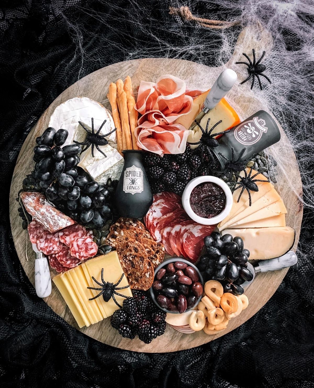 Accents: Surround the board with gothic and seasonal accents, such as black grapes, purple figs, pitted black olives, and artisan crackers.